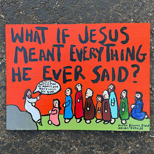 Justin Atkin is a self taught artist, born and raised in South Carolina, and growing up in the Saylors Crossroads Community of Anderson County, SC where his family has lived for generations. He now calls Honea Path home. He's a local historian and a storyteller. Justin's art reflects that history, but most of all it reflects the people. Notice the great detail he injects in his story telling art pieces. He likes bright colors and true stories of the strange, the miraculous, and ironically - the common.