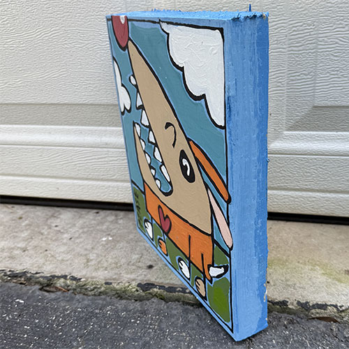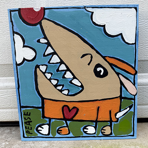 Ken Pease is an artist with an interesting path that led to making his art. He worked as a graphic artist for more than 25 years, and sells his paintings at art and music shows, galleries, and several of the House of Blues locations. His work is inspired by his love of music, and his kids. He paints on repurposed wood scraps, cabinet doors, and instruments.