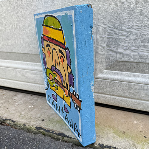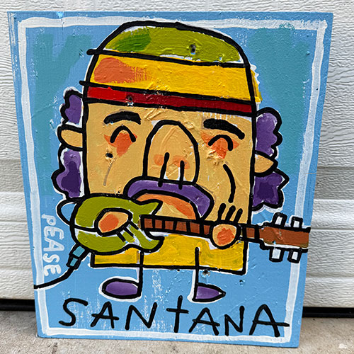 Ken Pease is an artist with an interesting path that led to making his art. He worked as a graphic artist for more than 25 years, and sells his paintings at art and music shows, galleries, and several of the House of Blues locations. His work is inspired by his love of music, and his kids. He paints on repurposed wood scraps, cabinet doors, and instruments.