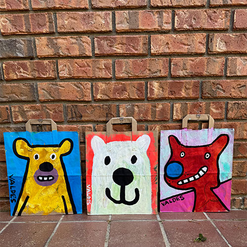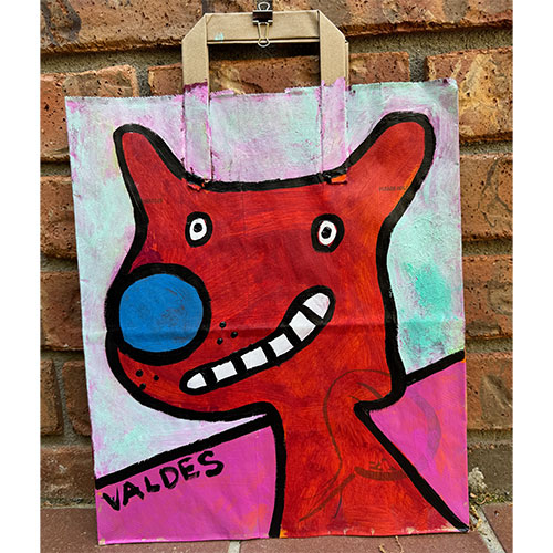 Measures 12" wide x 14" long (16.5" to handle top). Acrylic on your basic paper shopping bag. Hang by the clip or have it framed in a shadow box for maximum impact. Ships within the continental USA for $12. Does not ship outside the U.S.