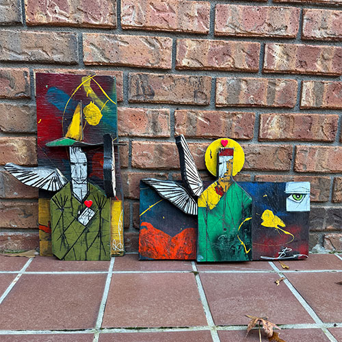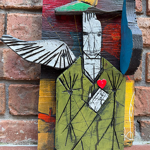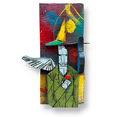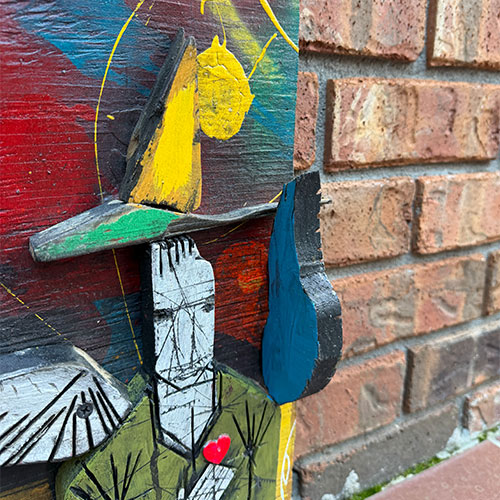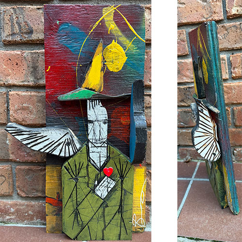 This mixed media assemblage presents with bold color, distressed textures and reclaimed materials. The piece is 11" wide and about 17.5" long and 5.5" thick. The carving feels protective but also tattered; like a guardian that's been through a lot. This may be a guardian who watches over small spaces and quiet moments.