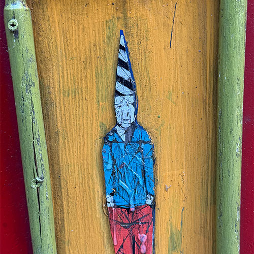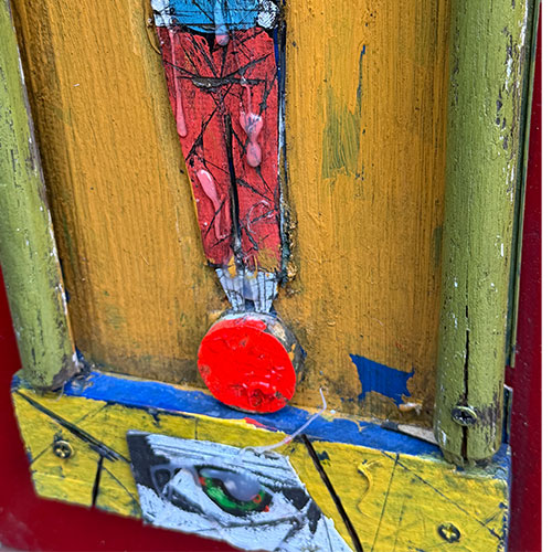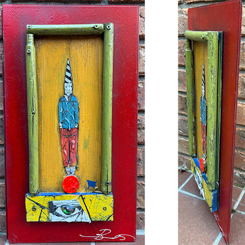 This mixed media assemblage presents with bold color, distressed textures, reclaimed materials and creates a feel of a contemporary icon. The piece is 12" wide and about 21.5" long.