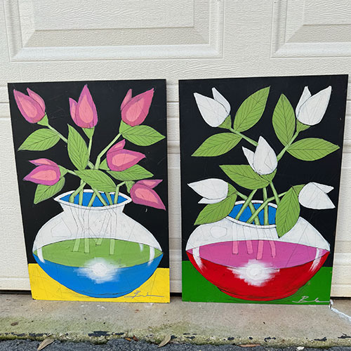 This acrylic painting is on thin board 16" wide and 24" long.