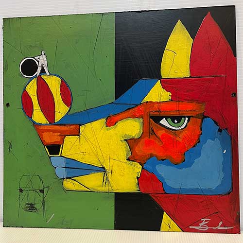 This original painting is 16" wide and 15" long. Painted on wood. Take a close look at the painting for it does have personality. If there are holes on the sides are the result of how Michael displayed them in his booth. If you like perfect - this is not for you.
