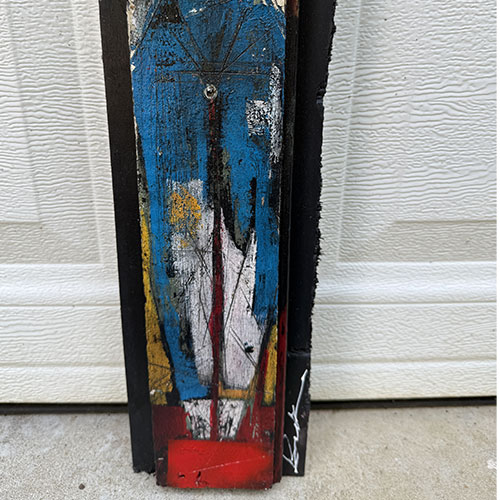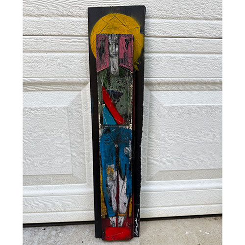 This piece is 24" long, 5" across and 1" deep. The figure is carved by Michael from the wood he uses to display his work during a show. He mounted the figure on found wood flooring plank.