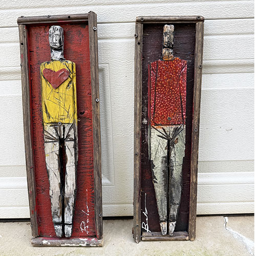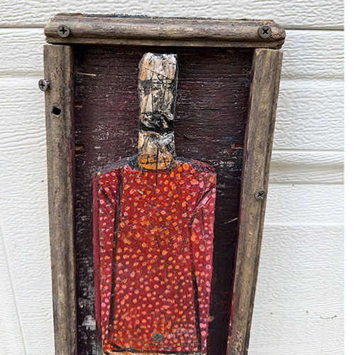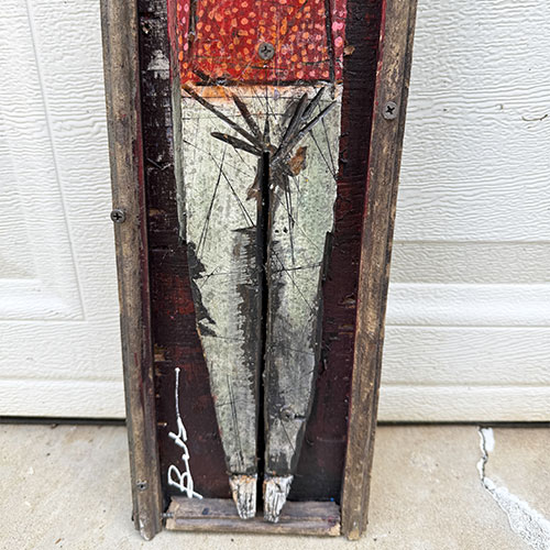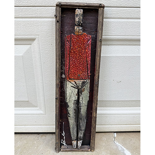This piece is 22" long, 6.25" across and 1" deep. The figure is carved by Michael from the wood he uses to display his work during a show. He mounted the figure on found wood and then framed it with more found wood.