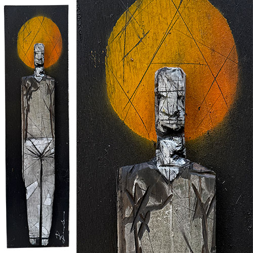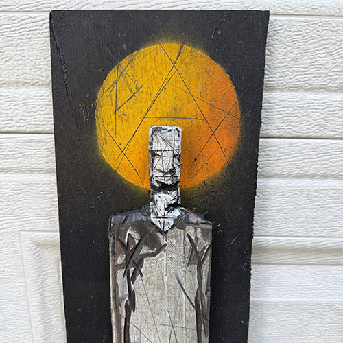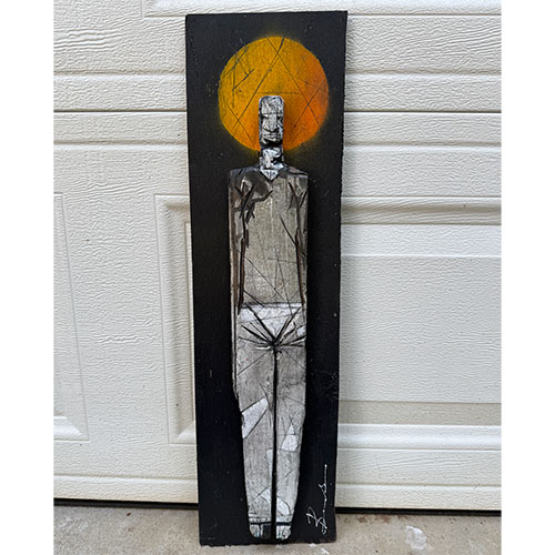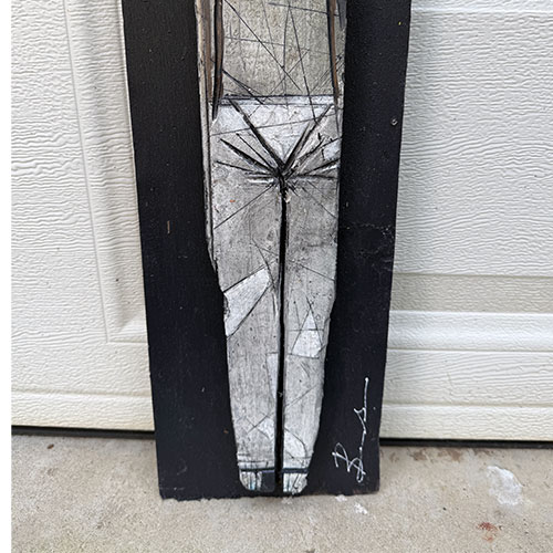 This piece is 25.75" long, 7" across and 1" deep. The figure is carved by Michael from the wood he uses to display his work during a show. He mounted the figure on found wood flooring plank.