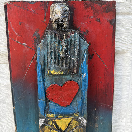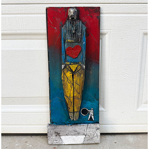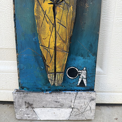This piece is 21" long, 8.25" across and 1" deep. The figure is carved by Michael from the wood he uses to display his work during a show. He mounted the figure on found wood flooring plank.