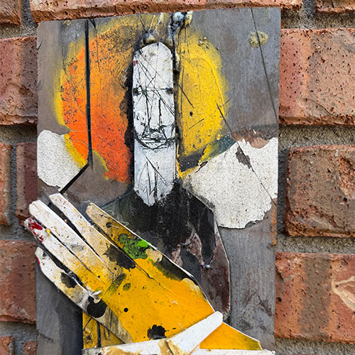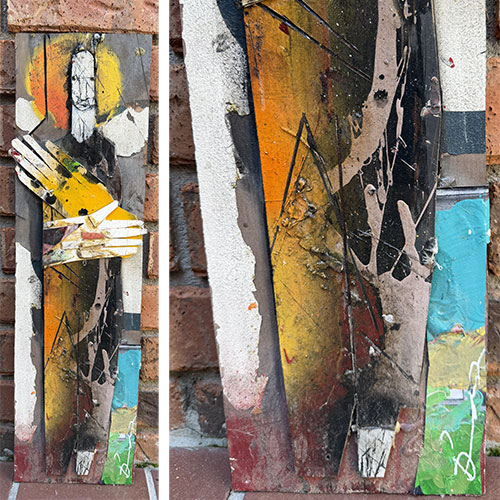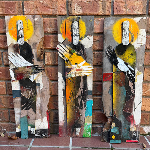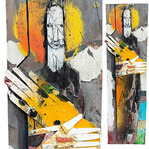 Despite the rough edges and distressed surfaces, the composition radiates a sense of calm resolve. The figure is built from fractured surfaces, layered pigments, and scraped surfaces. The body is patched, weathered and reimagined. The piece is 7" wide and about 25.5" long and .5" thick.