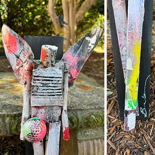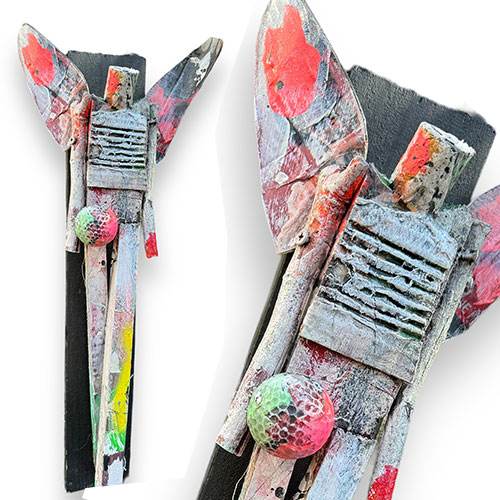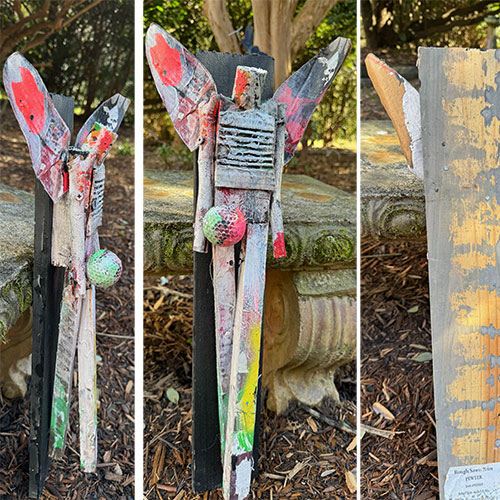 This angel assemblage is attached to a back board (21" long x 3.5" wide). The piece totals 22" long, 9" wing tip to wing tip