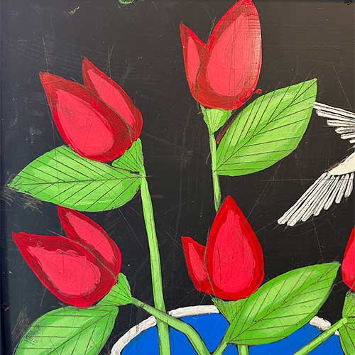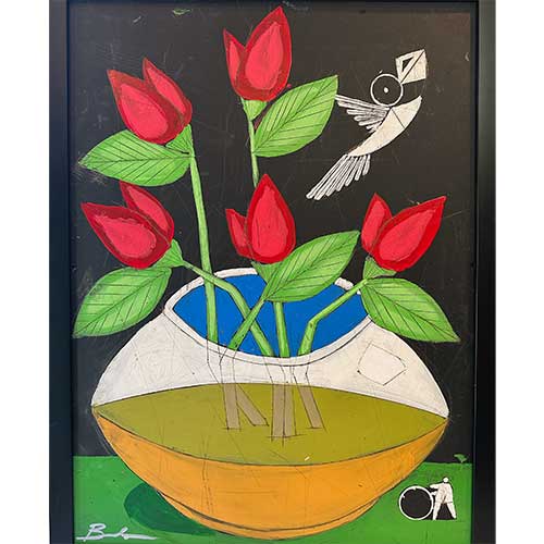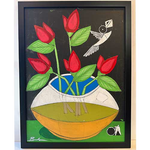 This original painting is framed simply to avoid detracting from the art. Measures 19.75" wide by 26" long. Painted on wood.
