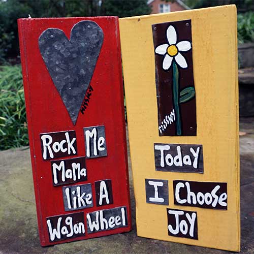 All work is painted on thick wood pieces, averaging 1.5" thick. You will notice they all are based on song lyrics. They are free standing, but also have a wire hanger on the back. Piece is is about 5.5" wide and 12" tall.