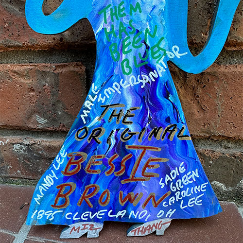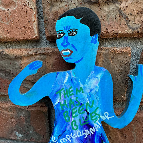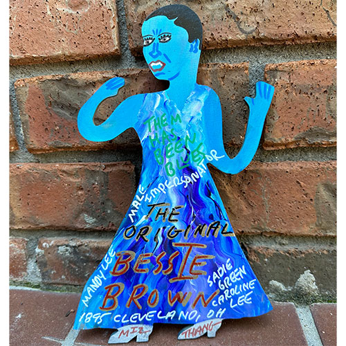 All Miz Thang's art is original. Her wooden pieces are usually cut out of cabinet grade birch and then sanded. She paints with acrylic paint and sometimes coats her pieces with shellac. She doesn’t use brushes but prefers to paint exclusively with her fingers. When her fingers are in the paint she feels connected to her art and feels she is passing along some of her special brand of mojo. She also uses objects she finds and that others give to her. Most of her art contains a message, sometimes serious, sometimes funny, depending on her mood.