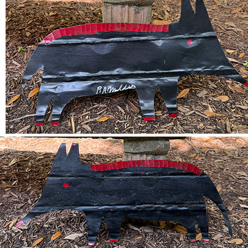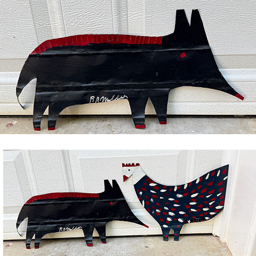 This piece is on tin, painted on both sides. 24" nose to tail. 11.5" tall.