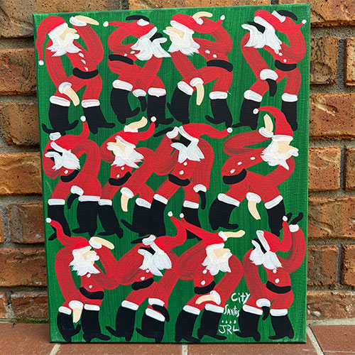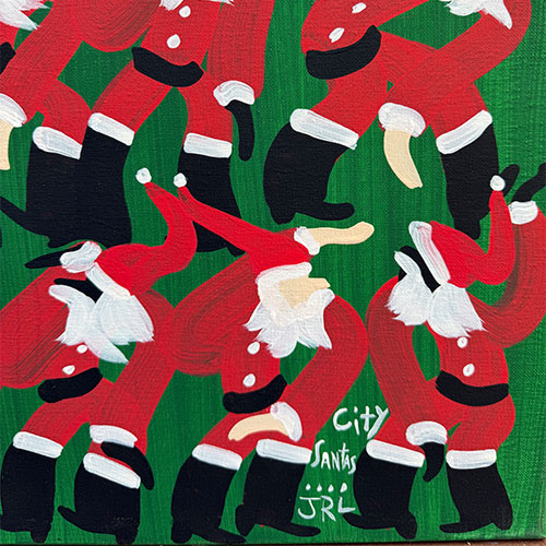 City Santas is 16" x 20" acrylic on canvas. Ships with tracking and insurance for $20. Does not ship outside the continental USA.