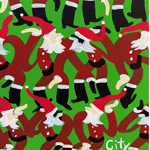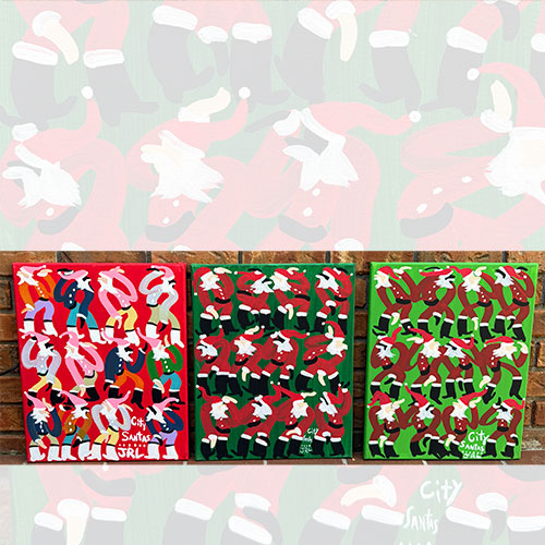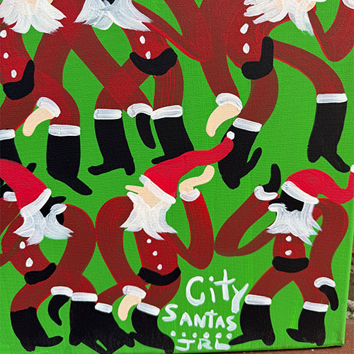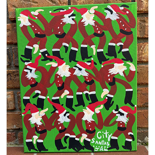 City Santas is 16" x 20" acrylic on canvas. Ships with tracking and insurance for $20. Does not ship outside the continental USA.