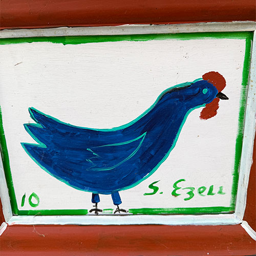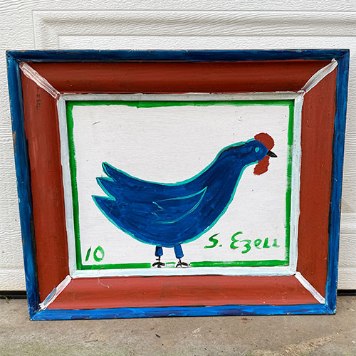 Sam Ezell is known for his painted large, orange, yellow, red and blue flowers on canvasses he built and stretched himself. He painted red, blue and polka dot chickens; Duke’s Mayonnaise and Mt. Olive pickles jars, church gatherings, and yellow taxis. His flat perspectives, simple figures and bright colors beam innocence. Then one day he woke to a cloud parked over his right eye. A blood clot in his neck had broke loose and settled in his eye. Before he lost his sight, he produced up to 50 pieces a week. He continues to paint though he’s adjusted his style to accommodate his restricted vision. He produces large canvases with broad strokes in abstract shapes. But he still paints the smaller pieces of mayonnaise jars and flowers.