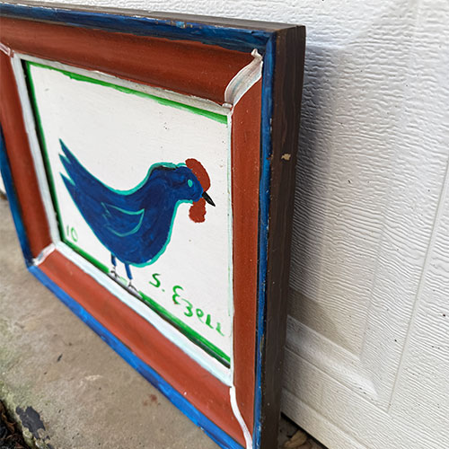 This is painted on wood and completed with a found frame that Sam has painted to compliment the painting. 18.5" wide and 16" long.
