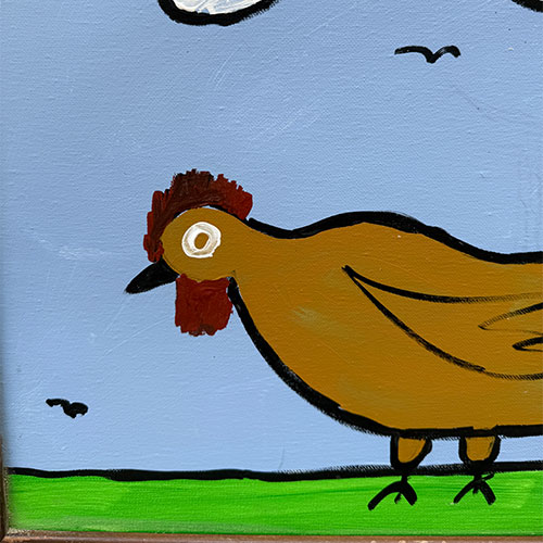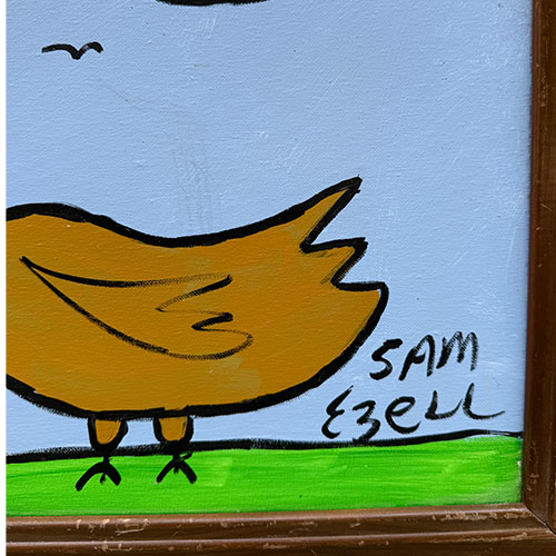 Sam Ezell is known for his painted large, orange, yellow, red and blue flowers on canvasses he built and stretched himself. He painted red, blue and polka dot chickens; Duke’s Mayonnaise and Mt. Olive pickles jars, church gatherings, and yellow taxis. His flat perspectives, simple figures and bright colors beam innocence. Then one day he woke to a cloud parked over his right eye. A blood clot in his neck had broke loose and settled in his eye. Before he lost his sight, he produced up to 50 pieces a week. He continues to paint though he’s adjusted his style to accommodate his restricted vision. He produces large canvases with broad strokes in abstract shapes. But he still paints the smaller pieces of mayonnaise jars and flowers.