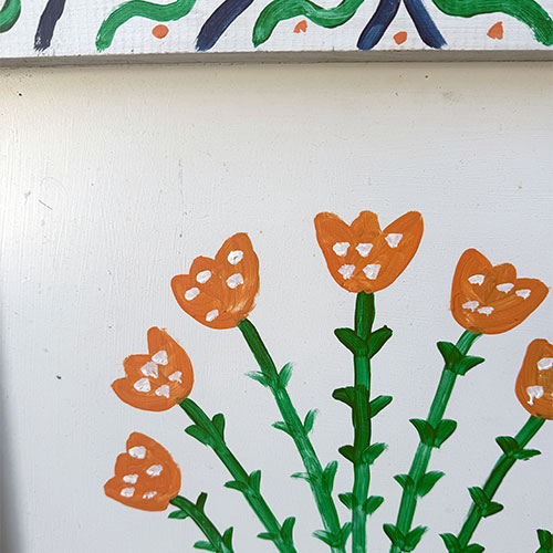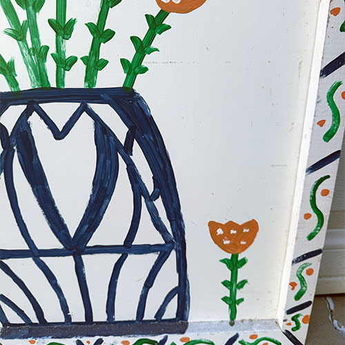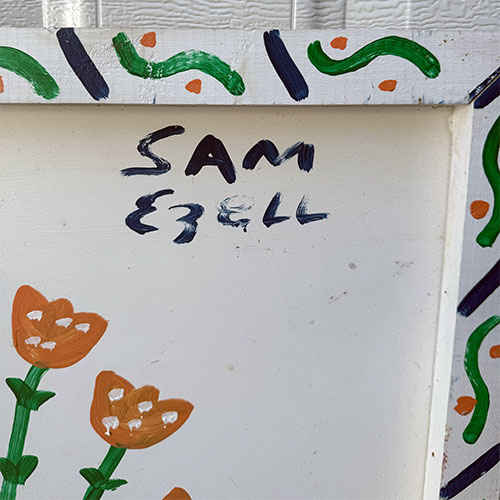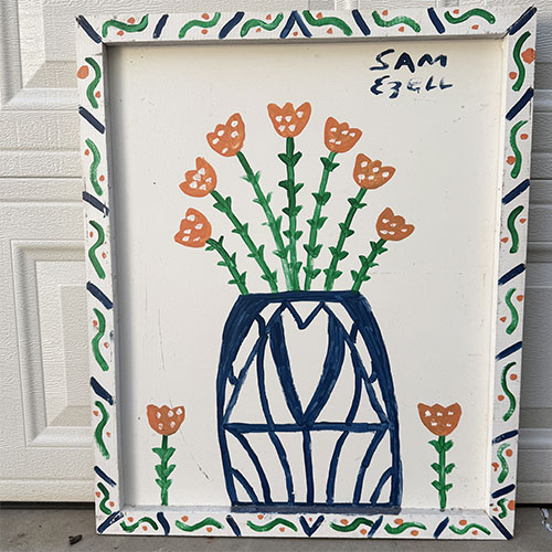 Sam Ezell is known for his painted large, orange, yellow, red and blue flowers on canvasses he built and stretched himself. He painted red, blue and polka dot chickens; Duke’s Mayonnaise and Mt. Olive pickles jars, church gatherings, and yellow taxis. His flat perspectives, simple figures and bright colors beam innocence. Then one day he woke to a cloud parked over his right eye. A blood clot in his neck had broke loose and settled in his eye. Before he lost his sight, he produced up to 50 pieces a week. He continues to paint though he’s adjusted his style to accommodate his restricted vision. He produces large canvases with broad strokes in abstract shapes. But he still paints the smaller pieces of mayonnaise jars and flowers.