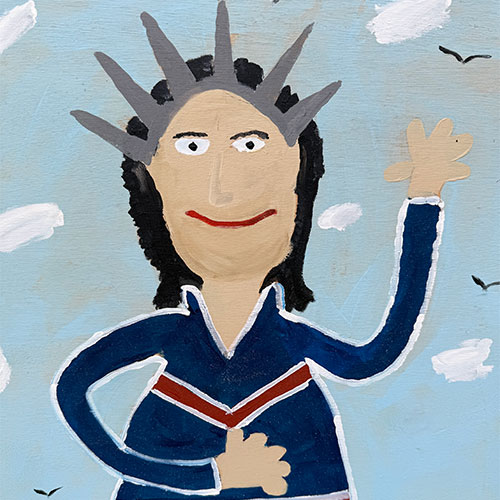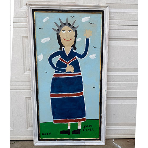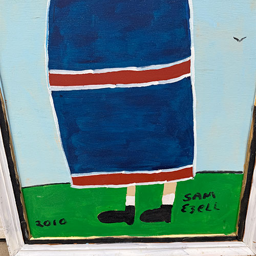 Sam Ezell is known for his painted large, orange, yellow, red and blue flowers on canvasses he built and stretched himself. He painted red, blue and polka dot chickens; Duke’s Mayonnaise and Mt. Olive pickles jars, church gatherings, and yellow taxis. His flat perspectives, simple figures and bright colors beam innocence. Then one day he woke to a cloud parked over his right eye. A blood clot in his neck had broke loose and settled in his eye. Before he lost his sight, he produced up to 50 pieces a week. He continues to paint though he’s adjusted his style to accommodate his restricted vision. He produces large canvases with broad strokes in abstract shapes. But he still paints the smaller pieces of mayonnaise jars and flowers.