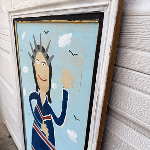 This is painted on wood and completed with a painted frame. 26" wide and 48" long.