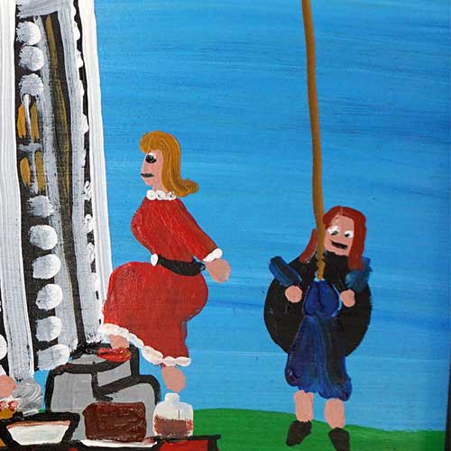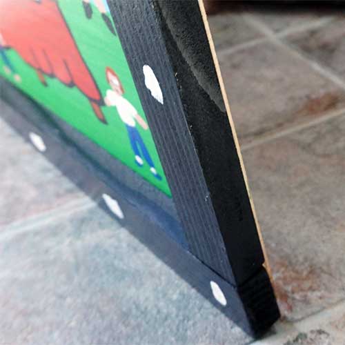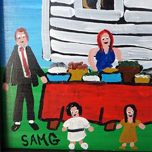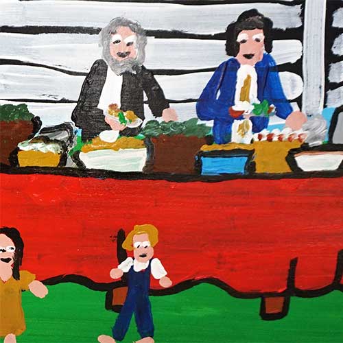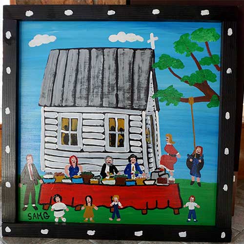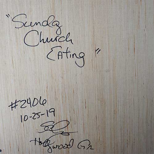"Sunday Church Eating" is a painting on wood measuring 24" wide, 24.5" long and .75" deep when meauring it including the frame. The image area is 21" x 21.5".Ready to hang.