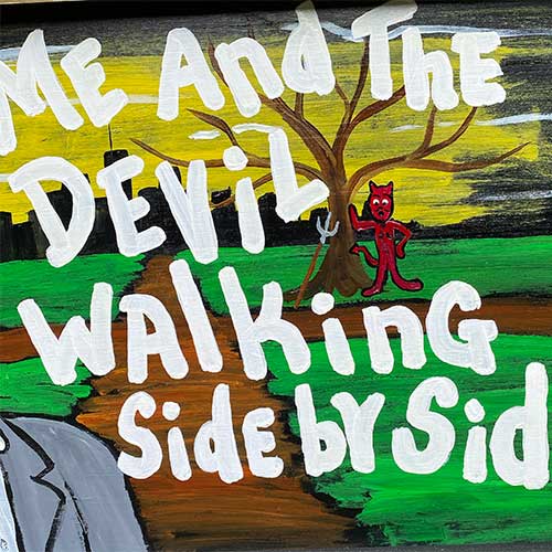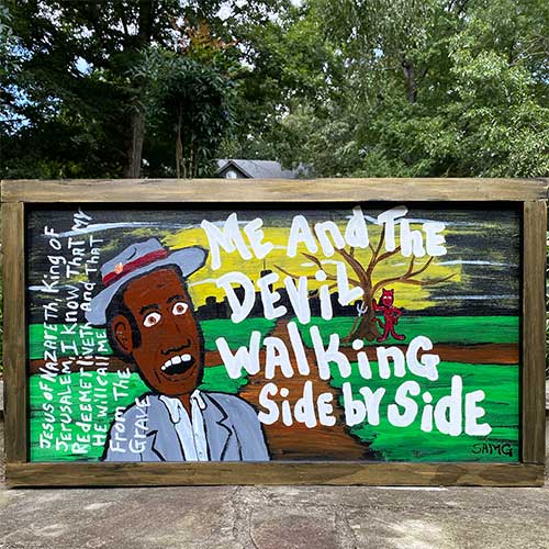 Me and the Devil measures 36" wide, 20.5" long including the frame. Ready to hang.