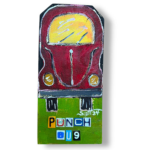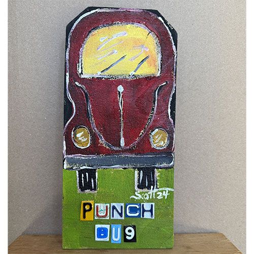Scott McQueen, a full-time resident artist at Kentuck Art Center, lives in Northport, Alabama. Scott creates fun and colorful folk art using repurposed and scrap materials, along with acrylics.