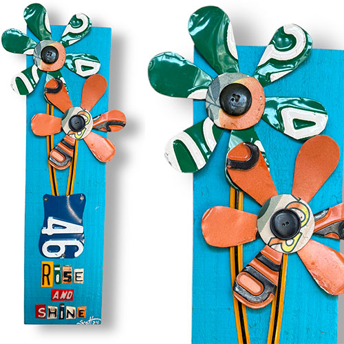 This mixed media piece is on a wood base 5.5" wide, 20" long and .5" deep. With the flowers, the width is 7". Ready to hang.