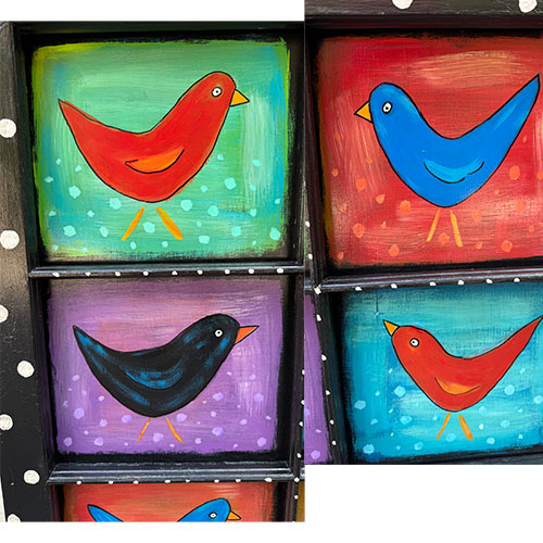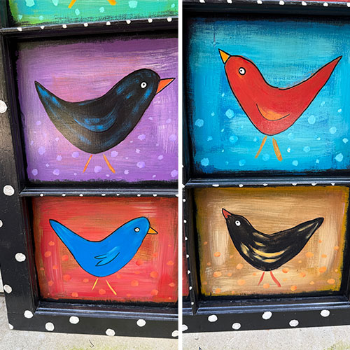 South Carolina artists Tim and Lisa Kluttz love bright colors! They utilize found, reclaimed and recycled materials to create happy, colorful and sometimes whimsical art work. Tim is the ultimate collector and recycler so there is never a shortage of materials. The couple’s styles are complimentary and favorite subjects are cats, flowers, dogs, chickens, mermaids and the Statue of Liberty. Their work can be found in galleries and at art shows throughout the Southeast and of course at their home studio, St. Peter’s Farm.