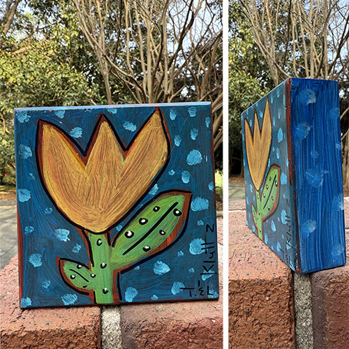 Created on a found wood. It is 5" wide, 5" long and is 1.5" thick.