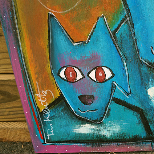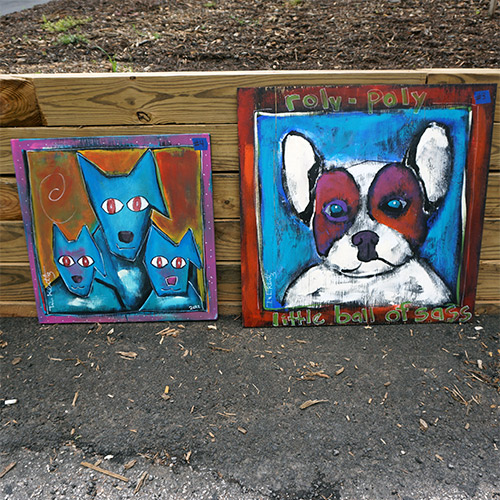 South Carolina artists Tim and Lisa Kluttz love bright colors! They utilize found, reclaimed and recycled materials to create happy, colorful and sometimes whimsical art work. Tim is the ultimate collector and recycler so there is never a shortage of materials. The couple’s styles are complimentary and favorite subjects are cats, flowers, dogs, chickens, mermaids and the Statue of Liberty. Their work can be found in galleries and at art shows throughout the Southeast and of course at their home studio, St. Peter’s Farm.