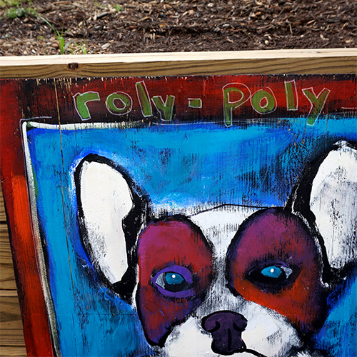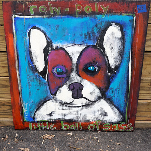 Created on a piece of recycled board, this Roly Poly Dog painting is 36" wide and 36" long.