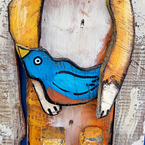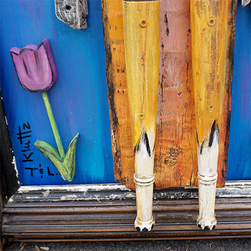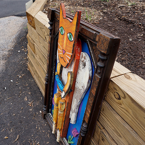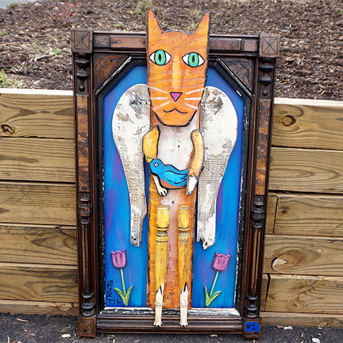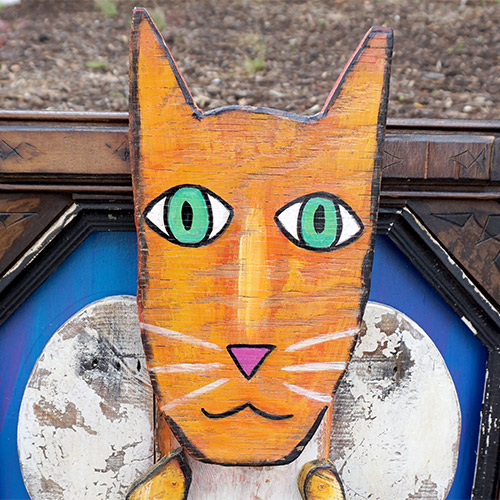 South Carolina artists Tim and Lisa Kluttz love bright colors! They utilize found, reclaimed and recycled materials to create happy, colorful and sometimes whimsical art work. Tim is the ultimate collector and recycler so there is never a shortage of materials. The couple’s styles are complimentary and favorite subjects are cats, flowers, dogs, chickens, mermaids and the Statue of Liberty. Their work can be found in galleries and at art shows throughout the Southeast and of course at their home studio, St. Peter’s Farm.