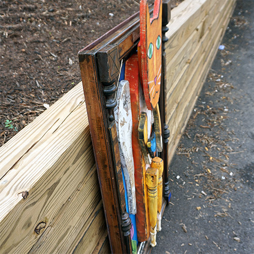 Created with pieces of recycled board and pieces of stuff, mounted on an old salvaged mirror (minus the glass). It's 24.5" wide and 41.5" long. I will not ship this piece. It's large and it's heavy. So if you add it to your cart it will be sitting here waiting for you. We'll help you load it into your car. Meanwhile, you can see it if you visit upstairs gallery.