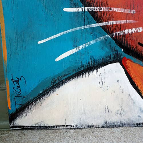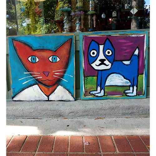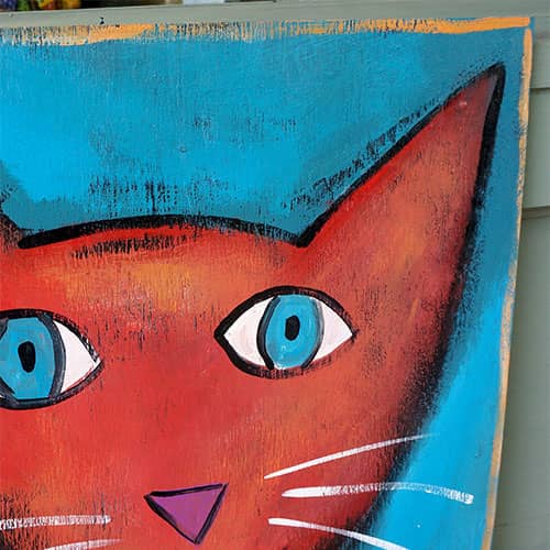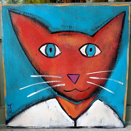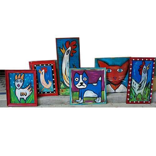 South Carolina artists Tim and Lisa Kluttz love bright colors! They utilize found, reclaimed and recycled materials to create happy, colorful and sometimes whimsical art work. Tim is the ultimate collector and recycler so there is never a shortage of materials. The couple’s styles are complimentary and favorite subjects are cats, flowers, dogs, chickens, mermaids and the Statue of Liberty. Their work can be found in galleries and at art shows throughout the Southeast and of course at their home studio, St. Peter’s Farm.