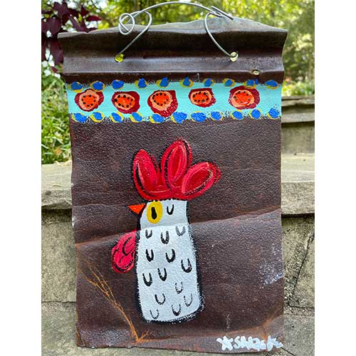 This piece measures 9" x 12" and is painted on recycled tin with acrylics.