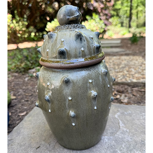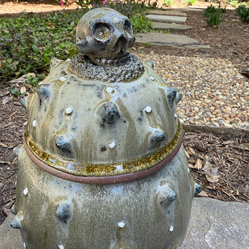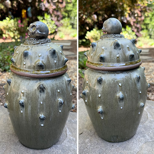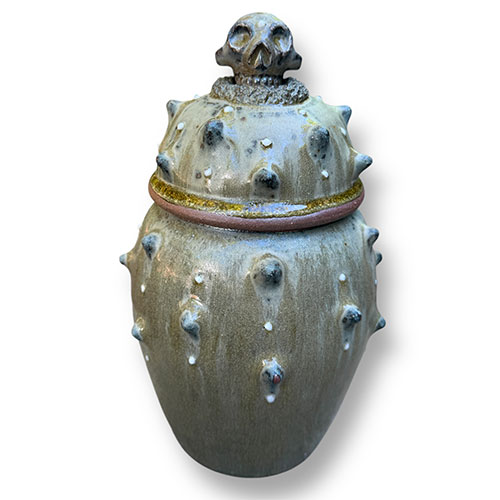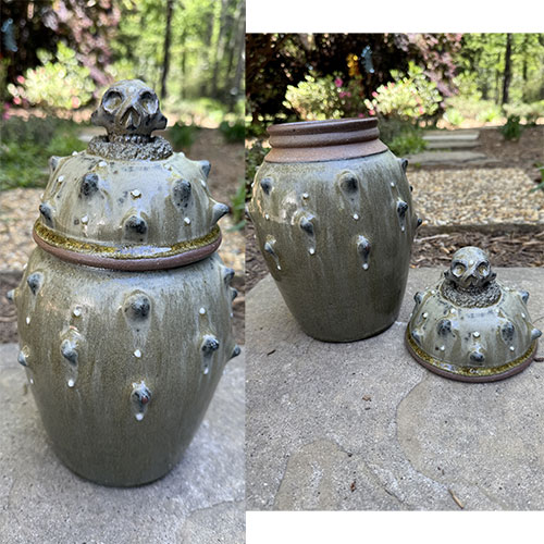 This striking lidded piece is a total 11" tall. 8" tall without the lid. The base is 4.5". The lid features a skull and the piece is decorated with moonstone.