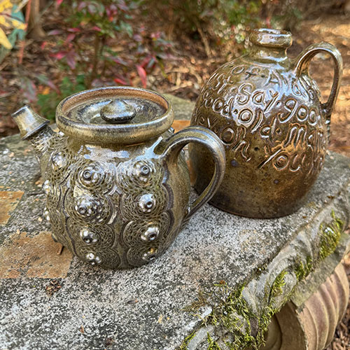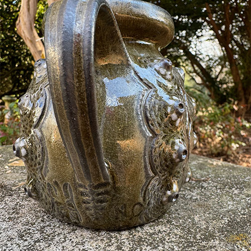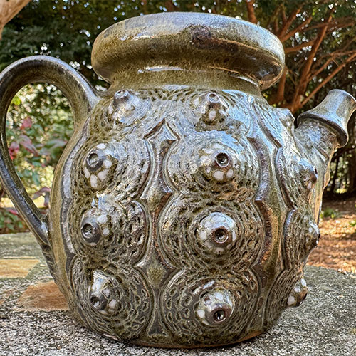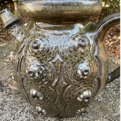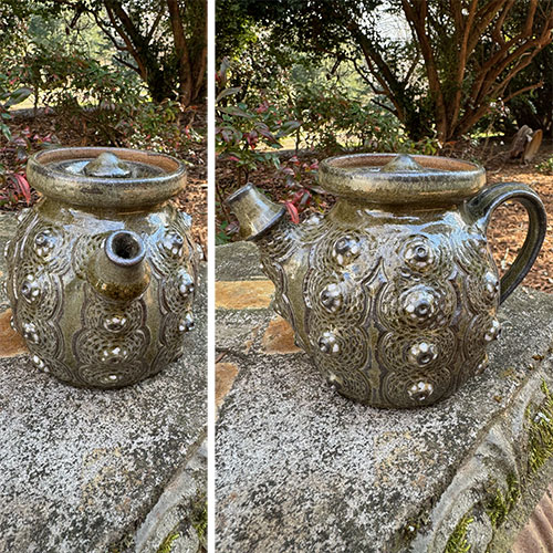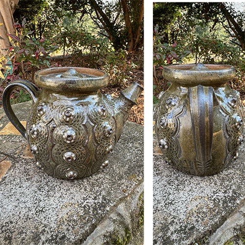 This striking tea pot is totally functional and is 5" tall with a 3.5" base. It is 7.5" from handle to spout. Woodfired in December 2023 at the Lincoln County Community Kiln.