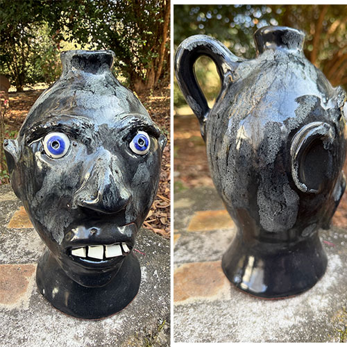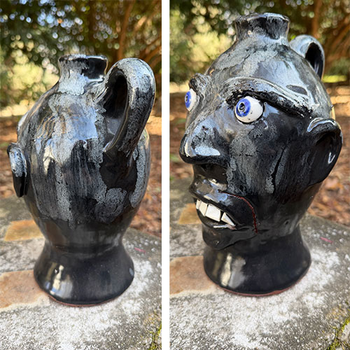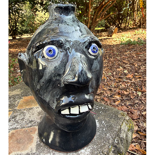 A striking face jug with vivid blue eyes that immediately command attention. The simplified facial structure—wide-set eyes, pronounced nose, and exposed teeth—creates a direct, almost confrontational presence. This piece ties closely to the historical lineage of Southern face jugs, where glass eyes and dark glazes were often used for dramatic effect. Craven’s version maintains that intensity while refining the form into a clean, highly readable sculptural vessel.