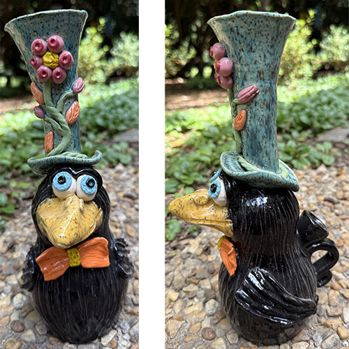 Crow in a hat is 10.5" tall, 7.5" deep and 4.5" wide.