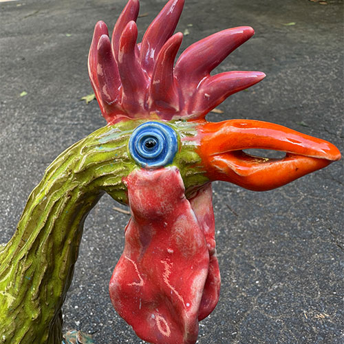 This funky rooster is 12" tall, 10" beak to tail and has a 4.75" base.