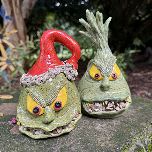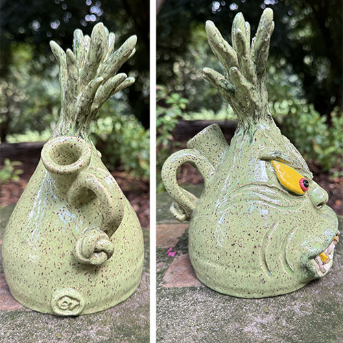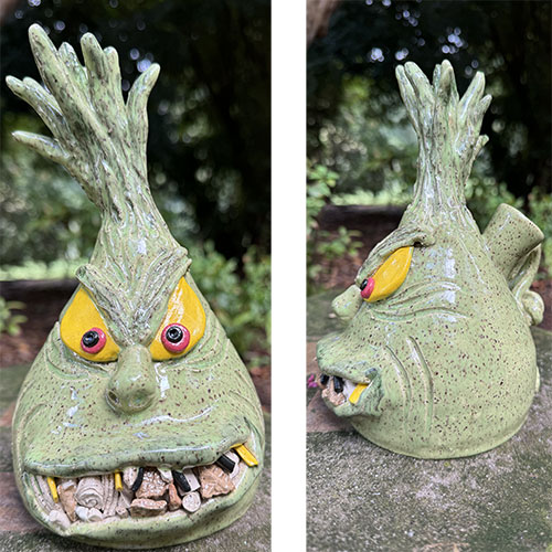 This Grinch jug is full of personality. 7.75" tall with a 4" base. Note that each tooth is individually formed and placed into his mouth.