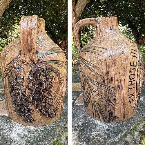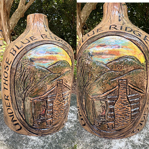 Breezy's handcrafted jugs are inspired by traditional Appalachian Folk Art and feature everything from wildlife to regional moonshining heroes. The process of handcrafting these jugs takes several days from the initial throwing, to carving and painting the final product.