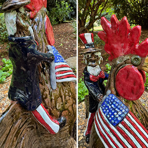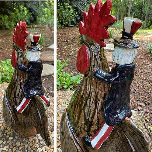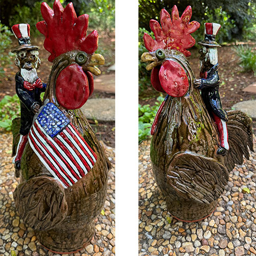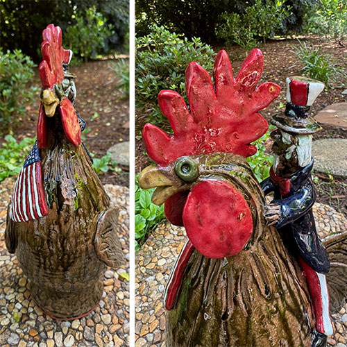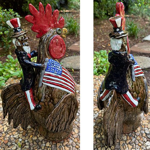 This Uncle Sam riding a rooster is 16.5" tall, 11" beak to tail, and 9" wide.