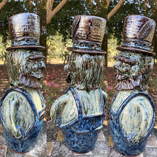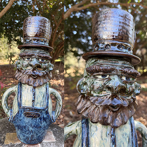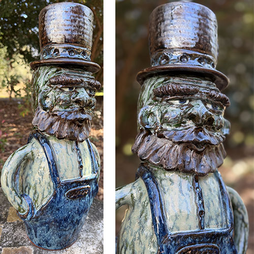 This 17-inch figural expands the traditional Southern face vessel into a fully realized character form. Depicting a bearded man in bib overalls and a tall, textured hat, the piece merges functional jug form with sculptural storytelling—an approach that places it firmly within the evolving language of contemporary folk pottery.
