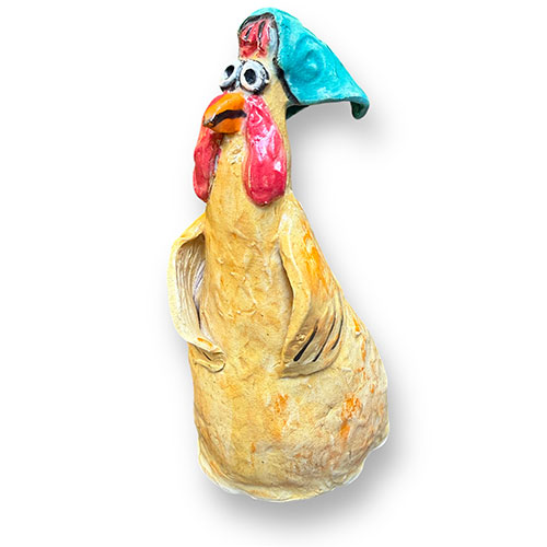 This kerchief wearing chicken is 6.5" tall and 3" wide and 2.5" deep.