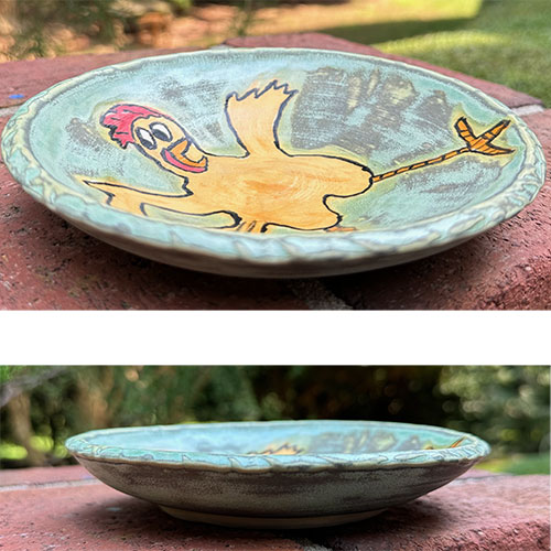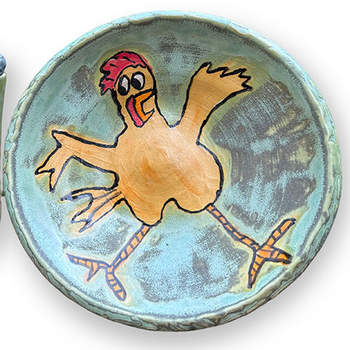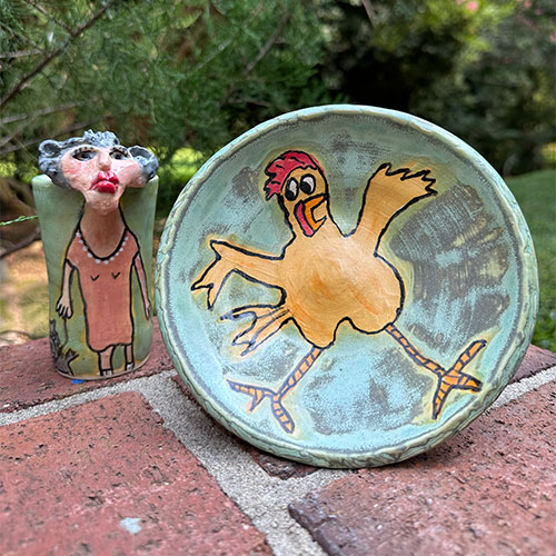 Carolyn Simmons is a Georgia folk art potter who delights in creating functional and non-functional pieces with a twist. We chose pieces with a chicken theme. Enjoy!