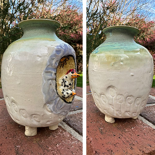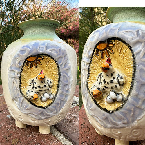 Carolyn Simmons is a Georgia folk art potter who delights in creating functional and non-functional pieces with a twist. We chose pieces with a chicken theme. Enjoy!
